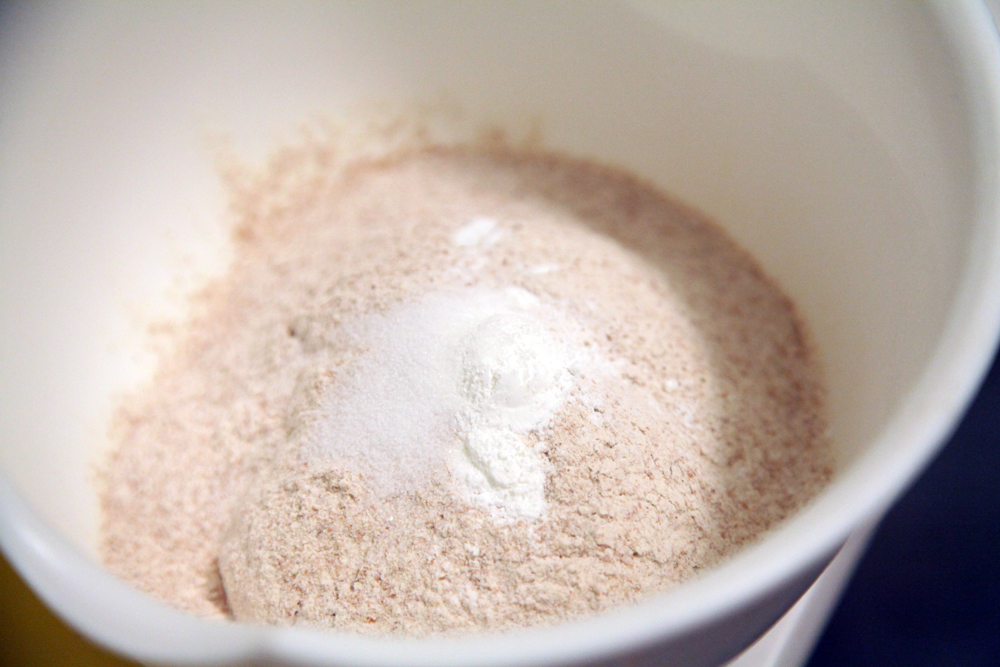 - In a small bowl, whisk together dry ingredients, including flour, baking powder and salt then set aside.