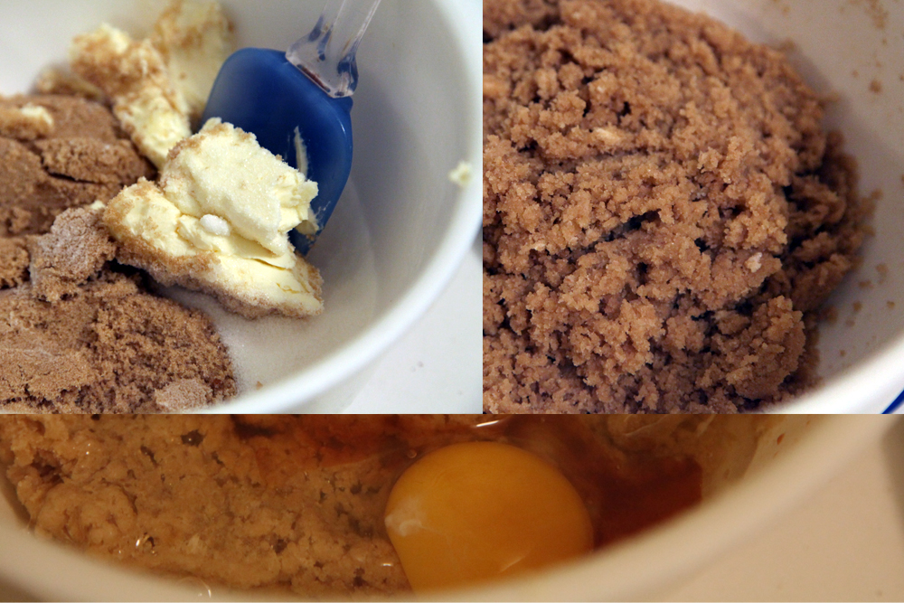 - In a large bowl, using a hand mixer cream butter and brown and white sugar until a fluffy texture in achieved. Add eggs and vanilla then combine.