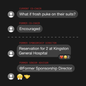 The current leader of the club asked, “What if the frosh puke on their suits?” to which the leader at the time responded, “[it’s] encouraged.” Members responded with heart and laughing emojis when another member commented “reservation for 2 at KGH [Kingston General Hospital].”